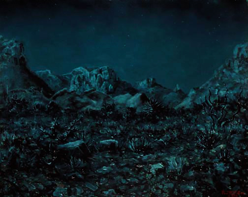 | In this Southwestern Night Scene Painting, "Juniper Canyon," an original oil on panel, I was inspired to represent the feel of the lush and virtually in penatrable high desert in Juniper Canyon at night, Big Bend National Park, TX. Painted on location. | |