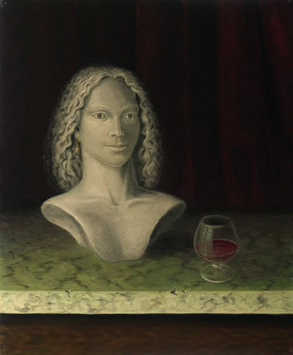 | This Figurative Painting / Still Life, "Marble and Wine," an original oil on panel, is an attempt to give the stone bust a bit of life. Marble is said to be the most alive of all the mediums used for the human form; thus a reflection in the eyes and a gold earring with opal along with a glass of wine, which is said to be a living thing. The bust is quirkier than I originally intended but carries a little something. I attempted to repaint this subject without the quirks, but in its more perfected future state of painting it carried nothing, so I cleaned off the panel for use elsewhere and left this the original version as is. | |