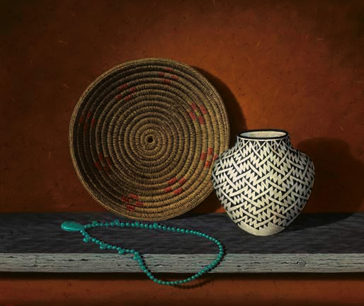 Southwest. The basket is old Jicarilla, the Indian pottery was