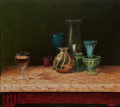| In this Still Life Painting, "Eclipse Light," an original oil on panel, I was inspired to paint the beauty of glass objects. During the execution of this painting a solar eclipse occurred. I painted the eclipsed Sun into the reflections on the objects in the setting. Note; Use a welding lens when viewing such a phenomenon. | |