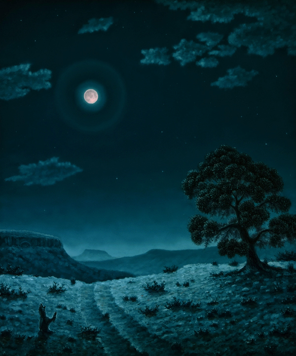 NOTE: This painting is a re-paint for a painting that was destroyed in a fire) In this Southwestern Night Scene Painting, "Night Roads," an original oil on panel, I was inspired to represent the feel of a desert road in the canyon lands at night, inviting you into the setting. Inspired by the canyon lands of Moab, Utah area where one often finds ancient pigmy Pinon trees standing at the threshhold of a fifty-mile view. Done from imagination. This painting is the second version of an ongoing series. |