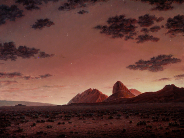 | This Southwestern Texas Landscape Painting, "Elephant Tusk and Backbone Ridge," an original oil on panel, is a major attempt at a painting a large scale version of this most beautiful of all places in the Chihuahuan desert to which I return to on occasion. In this case I wanted to show the long melding process that takes place in the luminosity of the sky and atmosphere that is thin and offers a hundred mile view south into Old Mexico. Things happen in the arrangement of light and cosmos that dwells here which doesn't happen any where else that I know of at sunset. Here is a place where the stars start to twinkle even before the sun sets. Every so often I return here even if only in spirit of mind. Should you have the time please go to Elephant Tusk and Backbone Ridge, Big Bend National Park, Texas and see for your self or just sit and stare at my painting for a good while. | |