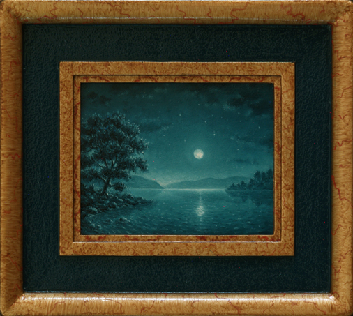 "Moonlit Mist II" Image Size 4 X 5 inches Framed Size 7-1/2 x 8-1/2 Oil on Panel No. 414 Sold Paul McMillan miniature oil paintings have jewel like details with finely blended smooth surfaces that show a little brushwork. Each miniature painting has a guilded plaster frame made by the artist. 7.5" x 8.5"outside, x 1" thick.