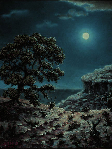 | In this Southwestern Night Scene Painting, "Night Roads," an original oil on panel, I was inspired to represent the feel of a desert road in the canyon lands at night, inviting you into the setting. Inspired by the canyon lands of Moab, Utah area where one often finds ancient pigmy Pinon trees standing at the threshhold of a fifty-mile view. Done from imagination. This small work is the first in an ongoing series. | |