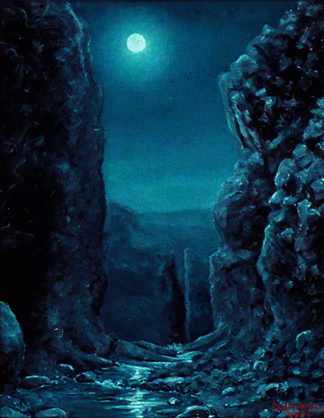 In this Southwestern Night Scene Painting, "The Window," an original oil on panel, I was inspired to represent the feel of the notch carved out by runoff in the basin at Big Bend National Park.