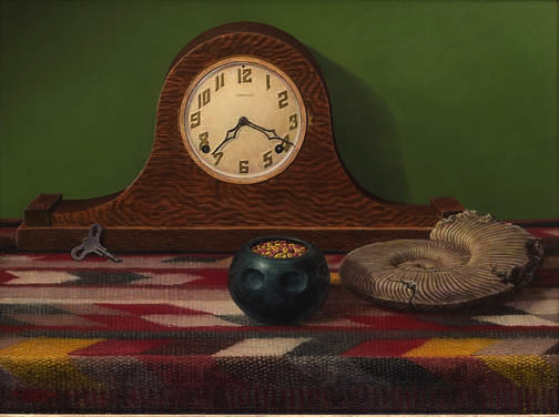 | In this Southwestern Still Life Painting, "Past, Present and Future," an original oil on canvas, it was my intention to represent the awareness of being limited in our time here, with a history and a potential for a future beyond ourselves. Using objects as symbols I chose an ammonite fossil, a key-wound clock with a fictitious name "McMillan Ltd.," and Indian pottery filled with corn seeds. This was my first attempt at painting a rug showing weave. | |