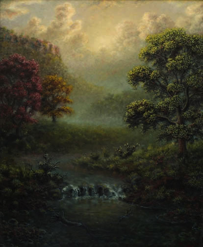 | In this Texas Landscape Painting, "Dawn," an original oil on canvas, I was interested in representing the soft aspects of Dawn with the details of the landscape with trees emerging from the morning mist. Inspired by the Texas Hill Country around Austin, Tx. From imagination. | |