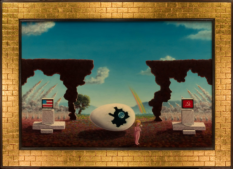 In this Surreal Geopolitical Painting, "Between Two Altars Of Fear A Little Girl Said: "I Just Want To Be A Flower When I Grow Up," an original oil on panel, I wanted to create an artwork in response to the Berlin Wall coming down. What I saw on television the day that the Wall fell in Berlin didn't seem real, and I thought that all of my life I had heard so much made of what we should fear from each other, that in fact the fear of total annihilation from both sides was the balance of power. I left my studio at 115 Martyrs' Lane, Taos, NM fearing nothing. Naturally, I ran straight into a group of five women and a child headed in my direction. Ila, the nicest person imaginable, and my neighbor who was ninety years old, introduced me to her friend of eighty-eight with her daughter of sixty-five, granddaughter in her forties, great-granddaughter in her mid twenties with her four-year -old child who was completely preoccupied with a fresh plucked dandelion that she was clutching. After discussing the big news of the day with these laidies, Ila, the oldest in this group, asked the little girl, the youngest, to tell us what she wanted to be when she grows up. The little girl's response was "I Just Want To Be A Flower When I Grow Up." I looked at the oldest lady in this group and realized that at ninety she was the full expression of the human flower. In this milli-second of thoughts the thing that struck me as the most surprising is that I almost felt frustrated with the child, as it was plain to see that for her, the dangers of the big bad world meant nothing compared to the beauty of the flower she was holding, and ultimately wanted to be when grown up. I got over it since ignorance is bliss and attempting to make beautiful paintings is my therapy. I made a sketch that afternoon and began painting the next day. The Taos News said "On the other hand, one of the worst---and an example of the figure as a literal motif incidental to the aesthetic---is Paul McMillan's oil, A Little Girl Said: 'I Just Want To Be A Flower When I Grow Up,' a piece that is as hard to look at as the title is to read." If I had it to paint over, and it is within my power, I still would not paint the little girl to look real, which is also in my power, nor would I put a real person in this position in real life if I had that kind of power, which I don't. |