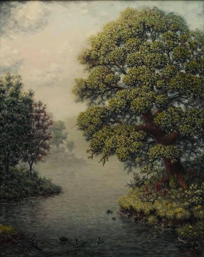 Oak beside a little inlet of translucent water. I like to tell