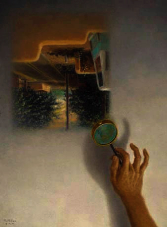 In this Figurative Painting, "Martyrs Lane," an original oil on panel, I was inspired to take a look at my studio world and make a record of it by casting an image of my world upside down and backwards on to the surface of a panel by using a magnifying glass. Then I included the figurative aspect of my hand along with the still life aspect of the magnifying glass itself and made a painting of the whole arrangement. To see another painting in this theme go to, "Focal Points and Vanishing Points", No. 25 |