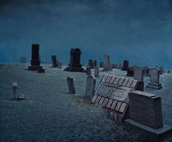 | In this Surreal Landscape Painting, "The Death of Justice," an original oil on panel, the idea of the "Death of Justice" is what motivated me to paint this image. In these Geopolitical times with the visage of war looming this painting may yet make more sense to us all. No disrespect to the Justice family intended. | |