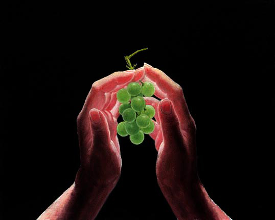 In this Figurative Painting, "Handheld Grapes" an original oil on panel, I was interested in studying the luminosity of a hands as well as cluster grapes in a cathedral shaped hand arrangment.