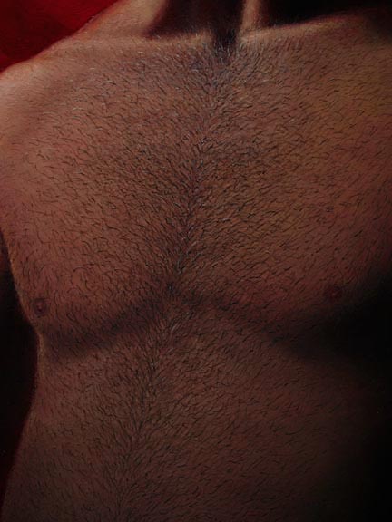 Body hair is generally not painted in an artwork that is figurative, however in this painting I chose to do so. In order to achieve the desired effect I painted one hair at a time. It only took three and one half days to accomplish. To Detail (1) (2) (3) (4) (5) (6) (7) (8) (9) (10) (11) (12) Back to "The Unveiling of Thought"
