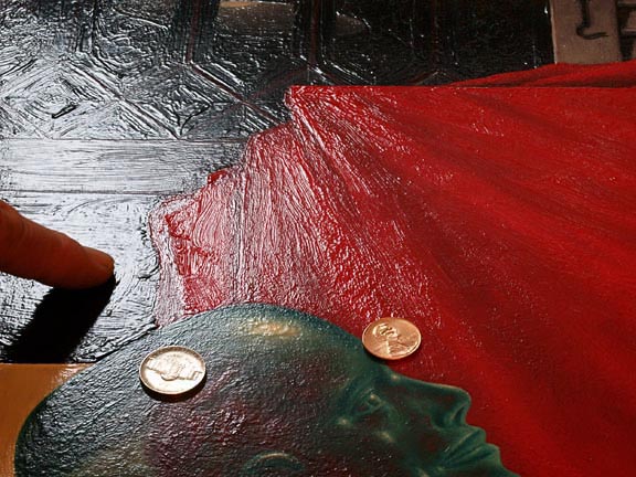 Surface Texture Details of a painting are part of what makes an artwork interesting, so I make an attempt to show them in this manner in order to give an interested viewer a look at the textures of the painted surface. This painting has both smooth areas and impasto areas that purposefully catch light. The varnish has a certain sheen but is not glassy or wet looking. I hope the above photograph will give you a better understanding of what the surface of this painting actually looks like. To Detail (1) (2) (3) (4) (5) (6) (7) (8) (9) (10) (11) (12) Back to "The Unveiling of Thought"