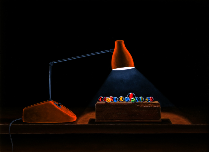In this original, 18" x 24" oil painting on panel, titled "Don't Loose Your Marbles" I was revisiting my childhood and re-coveting the marbles that once drew me into their inner world of cat eyed swirling menageries of nebulae forming and wrestling into shapes forever trapped inside once liquid glass now frozen in time like thoughts of when a great and beautiful marble was the ultimate pride in the eye of my youth. Perhaps these marbles are an allagory about the what we should not loose as we travel through our stages of life,,,,,,,,,, |