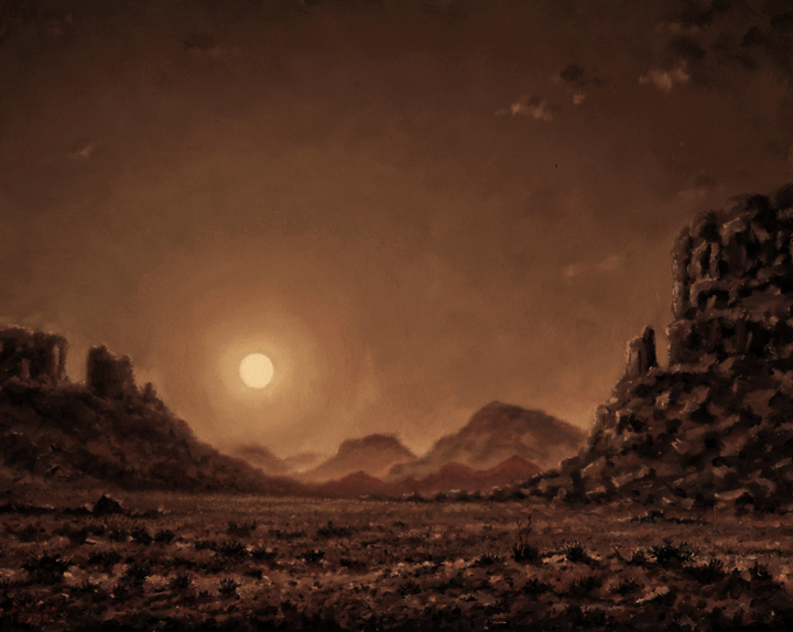 - In this Southwestern landscape painting, "Yellow Haze at Sunset," an original oil on panel, I was inspired to create a painting in a primarily Yellow color. I occasionally challenge myself to paint in a near monochrome yellow pallete. the problem is how to keep the yellow from turning green when I mix black into it. I have discovered that if you mix ivory black and alizarin crimson together it makes a black that is actually a dark purple and thusly the crimson is what controls or keeps the yellow from turning green so I can go from black all the way through the tones and values of the yellow as I paint my way to an ivory white color. The composition of this painting is purely from imagination in order to allow myself as much freedom in the arrangement as possible. This not being a real place I can arrange the elements in the subject to contain the best drama and luminosity that I can achieve. Here in this painting I offer my most valid attempt at keeping it simple. It is also a way for me to dispel some well worn habits and venture forward into some new territory to express the elements of nature to which I am most drawn to in a celebration of blended pigments.