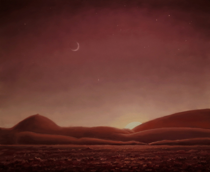| In this Surreal Painting, "Goddess of Sun and Moon," an original oil on panel, I was exploring the softness of textures and sensuousness beauty so present in woman kind. In my ever growing appreciation of the beauty of woman I present this laying lady landscape of the surreal metaphysical kind to allegorically let you in on some of what I find to be the most wonderful creation in all the universe. In consideration of the truth that all people, both man and woman are born too and through woman I find it to be of no surprise what-so-ever that the earliest of objects of worship were and in my hand still are woman. Perhaps we should still worship woman as the true god where the altar would be the tummy of woman upon which we might often lay our heads in awe as we worship life itself. At the very least the sun and moon should belong to woman kind until things get better for us all. | |
