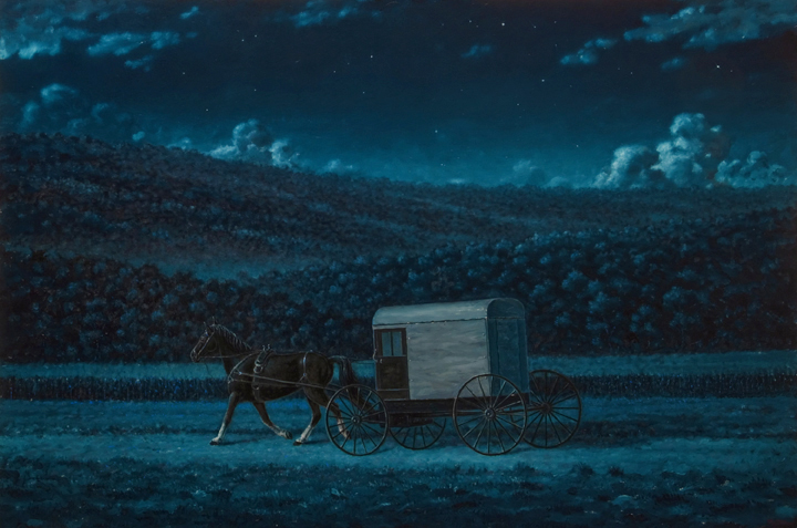 "Night Buggy" (2nd & larger version) 24" x 34" Oil on Panel No. 246 In this Pennsylvania Night Scene Painting, "Night Buggy," an original oil on panel, I wanted to convey the feel of traveling at night by horse and buggy. I found inspiration from seeing how the Amish traveled, both at night and by day in central Pennsylvania. This is the second version of this subject matter in which I wanted to open up the landscape a bit to effect an openness of land depth and atmosphere which I felt was needed to represent a larger world even from an intimate if not delicate nocturnal way of traveling to, or maybe from, what a moon-lit night such as this might have to offer the imaginary destinations of mind.