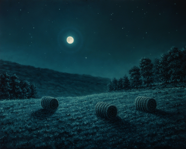 - In this Pennsylvania Night Scene Painting, "Hay Bales Nocturne", a commissioned piece,an original oil on panel, I wanted to once again continue exploring an ongoing arrangement of hay bales on the rolling Pennsylvania Landscape at night. I love making up these night worlds and for me, a westerner now transplanted to the Northeast I am captivated by the lack of level land and want to travel on theses tilted waves of mountains to a nocturnal infinity.