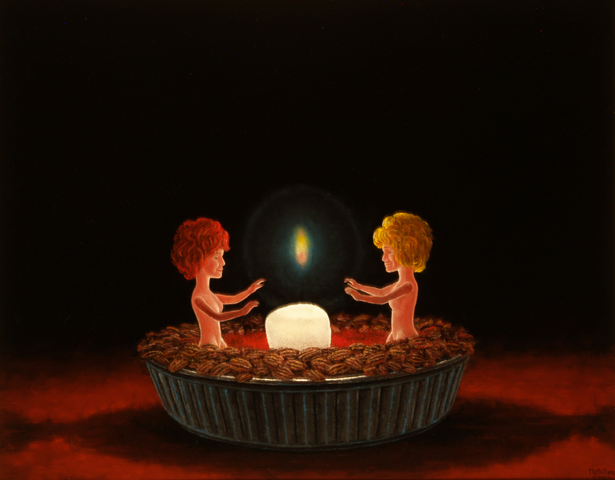 - In this 16" x 20' original oil on panel,"titled "Mona and Lisa", two Spirit-Dolls raising the spirits and sharing in the joy of roasting a marshmello in a pecan pie,
