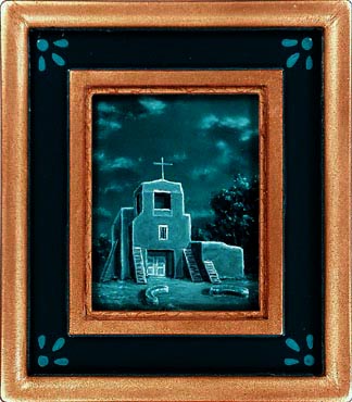 Paul McMillan Miniature Southwestern Night Scene Painting San Miguel Miniature 4"x 5" Image Oil on Panel No. 318 Sold Paul McMillan miniature oil paintings have jewel like details with finely blended smooth surfaces that show a little brushwork. Each miniature painting has a guilded plaster frame made by the artist.