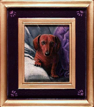 Paul McMillan Miniature Portrait Painting Portrait of a Miniature Dachshund Phineas Took Vom Ucon Miniature 4"x 5" Image Oil on Panel No. 331 Sold. Paul McMillan miniature oil paintings have jewel like details with finely blended smooth surfaces that show a little brushwork. Each miniature painting has a guilded plaster frame made by the artist.