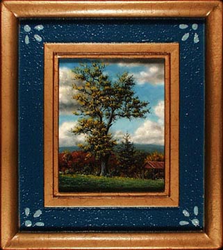 Paul McMillan Miniature Pennsylvania Landscape Painting Old Tree in Autumn Miniature 4"x 5" Image Oil on Panel No. 335 Sold. Paul McMillan miniature oil paintings have jewel like details with finely blended smooth surfaces that show a little brushwork. Each miniature painting has a guilded plaster frame made by the artist. 7.5" x 8.5"outside, x 1" thick.