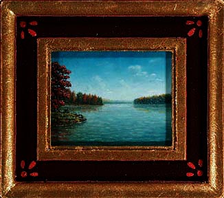 Paul McMillan Miniature Pennsylvania Landscape Painting Black Moshannon Lake Miniature 4"x 5" Image Oil on Panel No. 338 Sold. Paul McMillan miniature oil paintings have jewel like details with finely blended smooth surfaces that show a little brushwork. Each miniature painting has a guilded plaster frame made by the artist. 7.5" x 8.5"outside, x 1" thick.