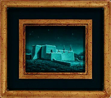 Paul McMillan Miniature Southwestern Night Scene Painting Las Trampas Night Miniature 4"x 5" Image Oil on Panel No. 346 Sold.