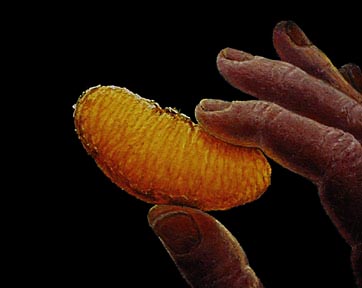 the luminosity of a hand held orange wedge. |