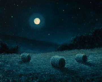 | This miniature painting, "Moonlight over Hay Bales," an original 4 x 5 inch, oil on panel, Is a miniature version of a larger painting "Moonlight over Hay Bales," # 189. Some larger paintings scale down well, some don't. Some people like minis, some don't. Il ike both so I paint hem both when possible as there is somthing for me to learn in each version. | |