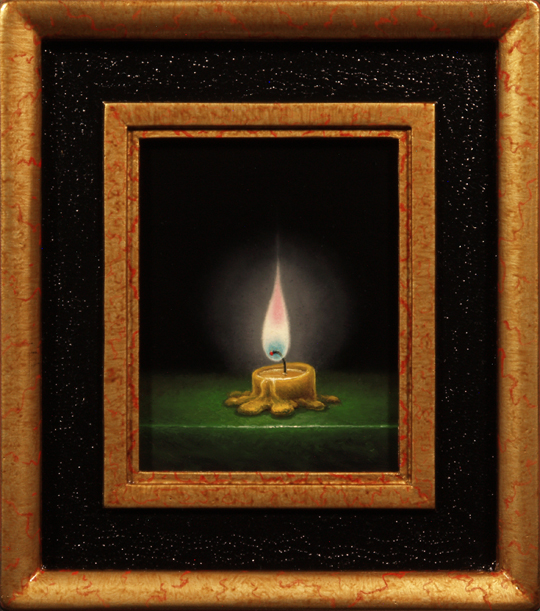 "Meltdown II" Image Size 4 X 5 inches Framed Size 7-1/2 x 8-1/2 Oil on Panel No. 398 Paul McMillan miniature oil paintings have jewel like details with finely blended smooth surfaces that show a little brushwork. Each miniature painting has a guilded plaster frame made by the artist. 7.5" x 8.5"outside, x 1" thick.