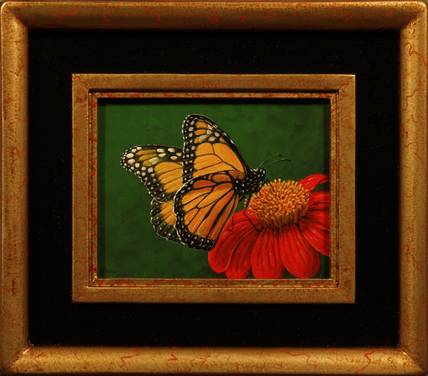 "Monarch Butterfly II" Image Size 4 X 5 inches Framed Size 7-1/2 x 8-1/2 Oil on Panel No. 407 Sold. Paul McMillan miniature oil paintings have jewel like details with finely blended smooth surfaces that show a little brushwork. Each miniature painting has a guilded plaster frame made by the artist. 7.5" x 8.5"outside, x 1" thick.