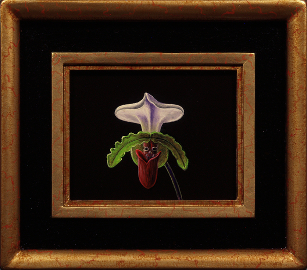 "Orchid" Image Size 4 X 5 inches Framed Size 7-1/2 x 8-1/2 Oil on Panel No. 408 Paul McMillan miniature oil paintings have jewel like details with finely blended smooth surfaces that show a little brushwork. Each miniature painting has a guilded plaster frame made by the artist. 7.5" x 8.5"outside, x 1" thick.