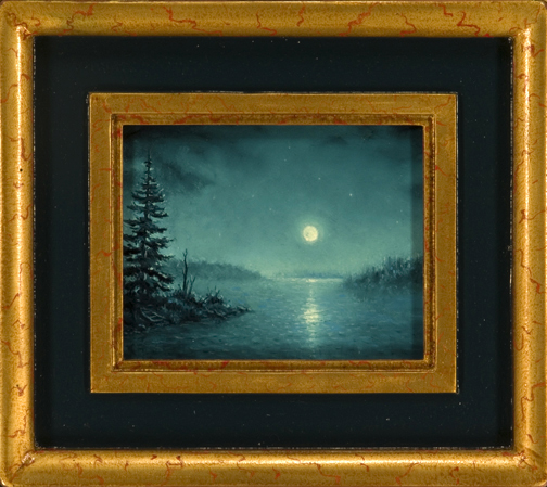 "Moonlight Mist" Image Size 4 X 5 inches Framed Size 7-1/2 x 8-1/2 Oil on Panel No. 409 Sold. Paul McMillan miniature oil paintings have jewel like details with finely blended smooth surfaces that show a little brushwork. Each miniature painting has a guilded plaster frame made by the artist. 7.5" x 8.5"outside, x 1" thick.