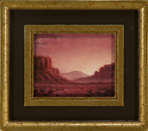 "Crimson Light" Image Size 4 X 5 inches Framed Size 7-1/2 x 8-1/2 Oil on Panel No. 411 Paul McMillan miniature oil paintings have jewel like details with finely blended smooth surfaces that show a little brushwork. Each miniature painting has a guilded plaster frame made by the artist. 7.5" x 8.5"outside, x 1" thick.