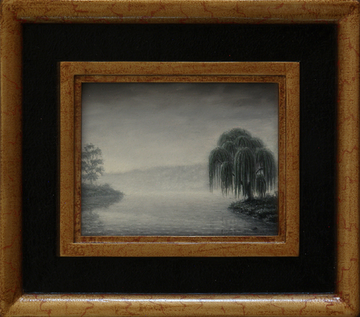 "Morning Mist with Willow" Image Size 4 X 5 inches Framed Size 7-1/2 x 8-1/2 Oil on Panel No. 415 Paul McMillan miniature oil paintings have jewel like details with finely blended smooth surfaces that show a little brushwork. Each miniature painting has a guilded plaster frame made by the artist. 7.5" x 8.5"outside, x 1" thick.